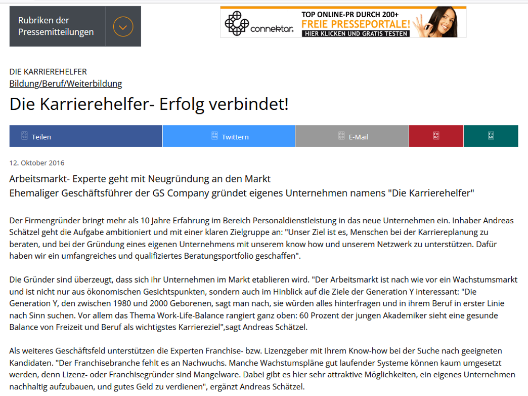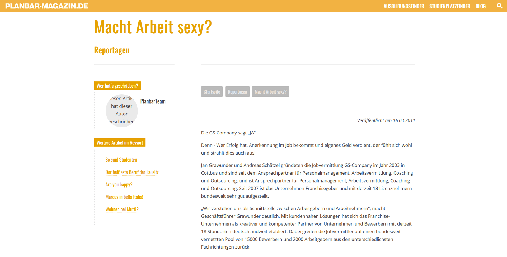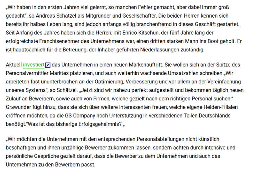 Vom kleinen 2-Mann-Büro zum Franchisegeber für mehr als 20 Filialen – eine Story wie aus dem Bilderbuch. Doch die beiden Gründer, Jan Grawunder und Andreas Schätzel, sehen die Entwicklung eher entspannt.“Das Wachstum des Unternehmens, sehen wir als Ergebnis aus fleißiger Arbeit, Kontinuität und Weiterentwicklung“, so Jan Grawunder. Von Cottbus aus durch die gesamte Bundesrepublik sind diese Herren auf der Suche nach den tatsächlichen „Helden der Arbeit“. Seit 2003 sind sie vermittelnd tätig und bringen Arbeitssuchende und Wechselwillige in Festanstellung – und das scheinbar sehr erfolgreich . „Wir haben in den ersten Jahren viel gelernt, so manchen Fehler gemacht, aber dabei immer groß gedacht“, so Andreas Schätzel als Mitgründer und Gesellschafter. Die beiden Herren kennen sich bereits ihr halbes Leben lang, sind jedoch anfangs völlig branchenfremd in dieses Geschäft gestartet. Seit Anfang des Jahres haben sich die Herren, mit Enrico Kitschun, der fünf Jahre lang der erfolgreichste Franchisenehmer des Unternehmens war, einen dritten starken Mann ins Boot geholt. Er ist hauptsächlich für die Betreuung, der Inhaber geführten Niederlassungen zuständig. Aktuell investiert das Unternehmen in einen neuen Markenauftritt. Sie wollen sich an der Spitze des Personalvermittler Marktes platzieren, und auch weiterhin wachsende Umsatzahlen schreiben.„Wir arbeiteten fast ununterbrochen an der Optimierung, Verbesserung und vor allem an der Vereinfachung unseres Systems“, so Schätzel. „Jetzt sind wir nahezu perfekt aufgestellt und bekommen täglich neuen Zulauf an Bewerbern, sowie auch von Firmen, welche gezielt nach dem richtigen Personal suchen.“ Grawunder fügt hinzu, dass sie sich über weitere Interessenten freuen, welche eigene Helden-Filialen eröffnen möchten, da die GS-Company noch Unterstützung in verschiedenen Teilen Deutschlands benötigt.“Was ist das bisherige Erfolgsgeheimnis? „ „Wir möchten die Unternehmen mit den entsprechenden Personalabteilungen nicht künstlich beschäftigen und ihnen unzählige Bewerber zukommen lassen, sondern achten durch intensive und persönliche Gespräche gezielt darauf, dass die Bewerber zu dem Unternehmen und auch das Unternehmen zu den Bewerbern passt. Wir vermitteln nicht nur kurzfristig Personal, sondern wir möchten langfristigen Erfolg für alle Beteiligten.“ Unsere Bewerber sehen wir nicht nur als Nummer in der Kartei, sondern als die Macher des Erfolgs. Was wären die Unternehmer ohne Ihre Mittarbeiter? Gute Mitarbeiter sind die wahren Helden der Arbeit! Die Berliner Agentur hektik.com, welche den Zuschlag für die Erstellung des neuen Markenauftritts der GS-Company bekommen hat, und die für ihre besonderen Markeninszenierungen bekannt ist, hat das mit dem entsprechenden Slogan scheinbar recht gut getroffen: „GS-Company – Helden der Arbeit“. https://www.niederlausitz-aktuell.de/cottbus/45170/gs-company-vom-kleinen-2-mann-buero-in-cottbus-zum-franchisegeber-fuer-mehr-als-20-filialen-bundesweit.html
